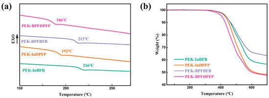 (a) DSC curves of PEK-Inx and PEK-BPFx and (b) TGA curves of PEK-Inx and PEK-BPFx.