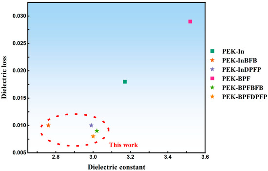 Comparison of dielectric constant and dielectric loss with PEK-In, PEK-Inx, PEK-BPF, and PEK-BPFx at 10 GHz.
