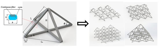 Truss structures are widely used in various industrial scenarios, and the concise and efficient design of a structure can be achieved by programming its mechanical properties [28]. We needed to choose a truss for parametric design, and in the end, we chose the pyramid truss because the pyramid truss has the following advantages: the structural form is simple and there are fewer structural parameters, which is conducive to using the structural parameters to control the mechanical properties; the structure is stable and uniform, with a strong bearing capacity; and the shape of the structure makes it easy to plan a continuous print path, with no overlap in the paths in the important bearing structure part, which is the most important reason. Maintaining a continuous print path can achieve better mechanical properties. As shown in Figure 1, the main parameters included in the unit are truss length (L), truss inclination angle (θ), truss width (d), truss thickness (h), and overlap thickness at the fold (Δx). A pyramid truss structure was formed by overlapping two continuous fiber composite filaments; furthermore, the four fulcrums at the bottom were connected and fixed with composite filaments. Here, the pyramidal cells are extended in two ways: (1) along the direction of the pyramidal cell composite wire, which allows for a simple array in both the horizontal and vertical directions but has the disadvantage of having many layer-to-layer individual nodes, which prevents the formation of tight connections and force transfer; (2) along the 45° direction, which doubles the relative density compared with the first method and allows for connections between the nodes and a tighter bond between the layers in the vertical direction.