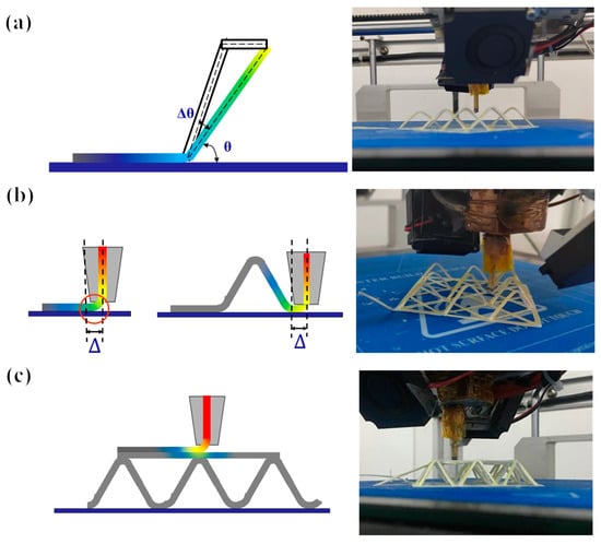 In the truss 3D printing process, the main errors arose from the following three factors: First, the deformation of the structure was caused by the traction force of the nozzle on the printed structure during the printing process, as shown in Figure 3. For this part, we changed the initial print path to print a larger tilt angle and then printed the designed tilt angle by moving it horizontally. We denoted the angle deviation value and nozzle-generated traction force as and F, respectively. The traction force perpendicular to the truss structure is . The deflection of the truss is regarded as the process of bending the single rod of the truss, and the maximum deflection of the beam deformation under a simple load gives the formula for the angle deviation value as follows: