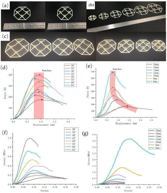 (a) The 2 × 2 pyramidal truss unit structure samples, (b) pyramidal truss structure samples of different scales, (c) pyramidal truss structure samples of different tilt angles, (d,f) compressive curves with different truss inclination angles, and (g,e) compressive curves with different truss scales.
