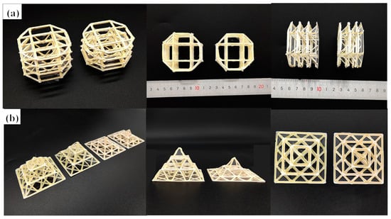 After systematically analyzing the relationship between the properties of the pyramidal unit structure and structural parameters, we further verified that the mechanical properties of the pyramidal unit were controllable in a multilayer structure. In the previous section, we accomplished the design and fabrication of a single layer of 2 × 2 pyramidal cells, in which it was necessary to fabricate a multilayer pyramidal structure; therefore, we designed several types of multilevel pyramid truss structures, as shown in Figure 5.