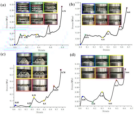 The compression of a multilayer pyramidal truss structure was analyzed using the compression test data and photographs, as shown in Figure 6. For pyramidal truss structures arranged directly in the vertical direction, regardless of whether the structure had three layers of the same height or three layers with varying height gradients, it maintained a certain load capacity until the overall structure failed and deformed completely. Evidently, for pyramid structures designed at the same height, when the strain was 0.78, all the three layers underwent deformation. Additionally, the second layer of the structure was damaged first; then, the top layer structure was compressed; and finally, the third layer of the structure was fully compressed owing to the printing accuracy. However, for pyramid structures designed at different heights, it can be clearly seen that the top layer was compressed first. From the influence of the structural parameters on mechanical performance, it can be seen that the top layer’s parameters lead to the failure of its structure more easily thus indicating a top-down failure form.