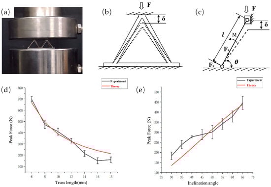 (a) Actual photo of 2*2 pyramid truss unit compression, (b) force analysis diagram of pyramid truss unit, (c) force analysis of simplified pyramid single truss, and comparison of experimental data and theoretical peak force: (d) different truss length and (e) different inclination.