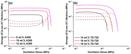 As oscillation stress increases, a steep decrease in G’ coinciding with a G” maximum is observed for A300 suspensions (Figure 2a). This effect, known as the Payne effect, was first observed for carbon black filled rubbers, and it is largely reduced for less active fillers [24,25]. Consequently, it is less notable for the TS-720 suspensions (Figure 2b). The oscillation stress at which G’ and G” meet defines the gel point of the suspension, and, as shown in Figure 2, it depends on silica concentration and surface chemistry. The stress at which G’ begins a steep decline characterizes the yield stress. It occurs at 6 kPa for the 12 wt.% A300 suspension and 0.20 kPa for the 18 wt.% TS-720 suspension. The yield stress of a suspension is an important parameter for DIW, since it indicates the minimum stress needed to observe deformation of the polymer network, or in other words, the minimum pressure required to cause the suspension to start flowing out of the printing nozzle.