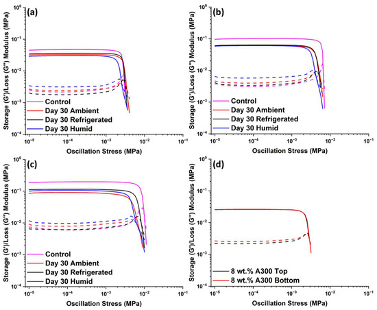 G’ (solid-line) and G” (dashed-line) of suspensions stored for 30 days in ambient, refrigerated, or humid conditions; (a) 8 wt.% A300 fumed silica, (b) 10 wt.% A300 fumed silica, (c) 12 wt.% of A300 fumed silica, and (d) 8 wt.% A300 suspensions based on the location in which the suspension was taken from the storage container.