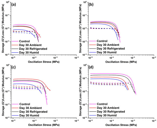 G’ (solid-line) and G” (dashed-line) of suspensions stored for 30 days in ambient, refrigerated, or humid conditions; (a) 14 wt.% of TS-720 fumed silica, (b) 16 wt.% of TS-720 fumed silica, (c) 18 wt.% of TS-720 fumed silica, and (d) 25 wt.% of TS-720 fumed silica.