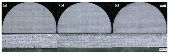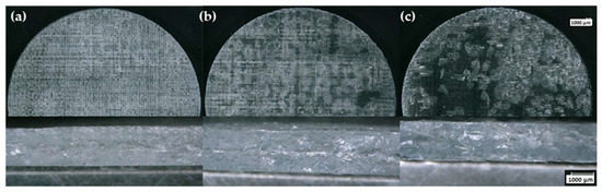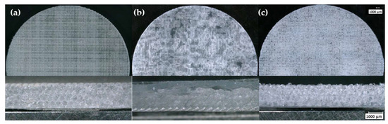 Optical microscopy images showing top view and cross-section of samples printed with (a) 8 wt.%, (b) 10 wt.%, and (c) 12 wt.% A300 control suspensions.