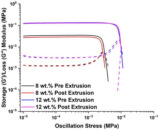 It is worth mentioning that the polymer-filler network may be negatively disturbed once the suspension is extruded from the printing nozzle, and such extruded suspension may have different rheological properties that may change its stability on the build plate. Thus, rheological properties were investigated for 8 and 12 wt.% A300 suspensions after they were extruded through the printing nozzle. Figure 10 shows that the extruded suspensions maintain their initial rheological properties indicating that extrusion from the nozzle during printing does not have a significant effect on the rheology of the suspension.