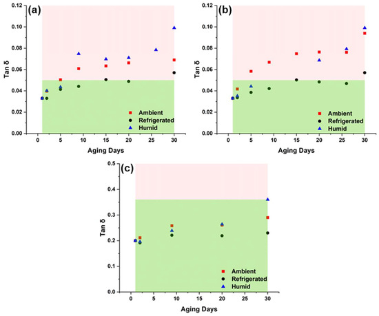 Tan δ versus storage time for (a) 10 wt.% A300, (b) 12 wt.% A300, and (c) 25 wt.% TS-720 suspensions stored in ambient, refrigerated, and humid environmental conditions. Red shaded areas represent poor printability, and green shaded areas represent good printability. The cut-off lines in (a) and (b) represent tan δ of the control 8 wt.% A300 suspension, which was not printable. The cut-off line in (c) represents the highest tan δ value observed for a 25 wt.% TS-720 suspension stored for 30 days and remained printable.