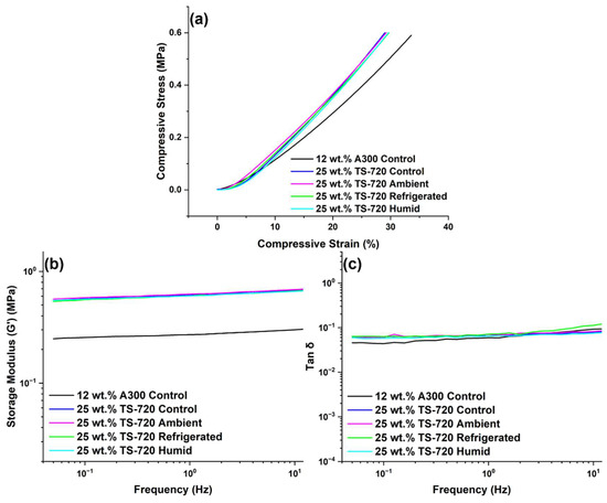 Another useful approach to verify the printability of aged suspensions is to perform mechanical experiments on the 3D printed pads. Because the rheology and printability of the 25 wt.% TS-720 suspension remained the most stable in all storage environments, the compressive stress-strain responses of samples printed with control and stored 25 wt.% TS-720 suspensions were investigated. As seen in Figure 12, no changes to mechanical properties were observed, once more confirming the robustness of this suspension under multiple storage conditions. The mechanical response of a sample printed with the control 12 wt.% A300 suspension is also provided in the same figure as a comparison. The differences in mechanical response for 12 wt.% A300 and 25 wt.% TS-720 can be explained by the increased filler concentration present in the TS-720 formulation. DMA results of the same printed samples confirm compressive stress-strain behavior.