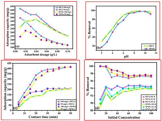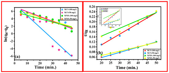 3.2.1. Study of Kinetics of Adsorption of Cd (II) onto the Adsorbents, MNPs, and MCS Composite