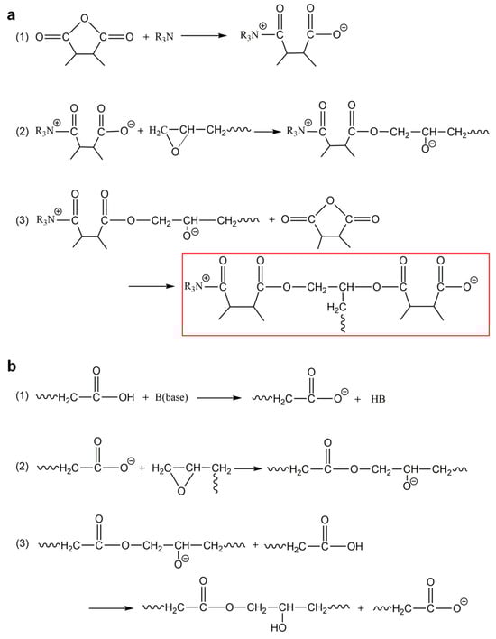 The potential mechanisms underlying the reactions between epoxy groups and anhydrides or carboxylic acids, catalyzed by bases, are depicted in Figure 2. Figure 2a illustrates various reaction steps involving the epoxy group and the anhydride, with a base (take R3N as the example) as the catalyst. Firstly, the anhydride reacts with R3N, resulting in the formation of a carboxylate anion. Subsequently, the carboxylate anion reacts with the epoxy group, causing the opening of the epoxy group and the formation of an alkoxide anion. Finally, the alkoxide anion reacts with another anhydride, leading to the formation of a new carboxylate anion []. Similarly, Figure 2b demonstrates the reaction steps between the epoxy group and the carboxylic acid, catalyzed by a base (abbreviated as B). Initially, the carboxylic acid reacts with the B, resulting in the formation of a carboxylate anion. Subsequently, the carboxylate anion reacts with the epoxy group, leading to the opening of the epoxy group and the formation of an alkoxide anion. Finally, a new reaction occurs between the alkoxide anion and another carboxylic acid.