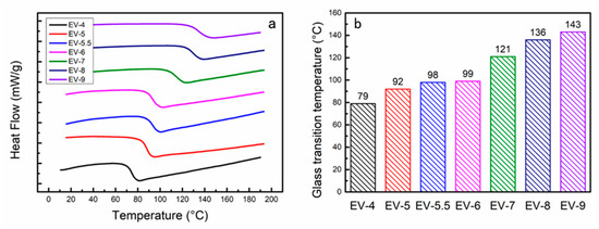 To investigate the effect of the curing agent on the Tg of the vitrimer, DSC was performed on the EV materials cured with varying levels of anhydride content in the curing agent. Figure 3a displays the DSC curves for the different EV materials, and Figure 3b illustrates their detailed Tgs. As depicted in Figure 3, the Tgs of the EVs gradually increased from 79 to 143 °C as the proportion of anhydrides in the curing agents increased. This can be attributed to two primary factors. First, the presence of rigid benzene rings in PA leads to significant steric hindrance, thereby raising the energy barrier for molecular chain rotation. Second, in contrast to carboxylic acids, the reaction of anhydride with epoxy groups, facilitated by a base catalyst, enhances the cross-linkage density of cured EV materials. Consequently, when the total molar amount of anhydride and carboxyl groups in the curing agent and the molar amount of epoxy groups in the epoxy oligomer were maintained at a 1:1 ratio, the higher the proportion of PA in the curing agent, the higher the Tg of the cured EV. The Tg of the cured EV increased beyond 90 °C when the molar ratio of anhydride to carboxyl groups in the curing agent was 5:5, which met the basic material requirements for low-orbit spaceflight [].