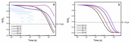 In order to investigate the rheological properties of EV materials at elevated temperatures, shear stress relaxation experiments were conducted on EV materials with Tgs exceeding 90 °C at 150 and 180 °C. The results presented in Figure 4 and Table 2 demonstrate that the majority of EV materials exhibited stress relaxation within the duration of the test (40,000 s) at both temperatures. This suggests that the EV materials were capable of undergoing a TER at higher temperatures, leading to changes in the cross-linked network’s topology. Notably, the relaxation times of EV-5, EV-6, and EV-7 at 180 °C were significantly shorter than those at 150 °C. This observation can be attributed to the accelerated TER rate at elevated temperatures, which expedites the rearrangement process of the cross-linked network.