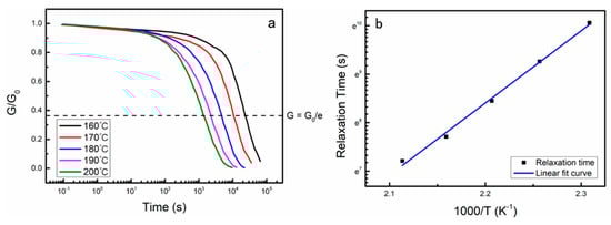 (a) Normalized stress–relaxation curves of the EV-5.5 material at different temperatures; (b) fitting of the relaxation times to the Arrhenius equation.