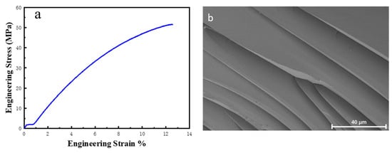 (a) Tensile curve of EV-5.5; (b) SEM image of the rupture cross-section.