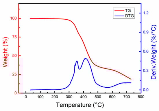 Thermogravimetric (TG) and differential thermal gravimetric (DTG) analyses were performed using a thermogravimeter (TGA-Q50, TA Instruments, Newark, Delaware, USA). The EV material was subjected to a gradual heating process in a nitrogen atmosphere, reaching a maximum temperature of 740 °C at a heating rate of 10 °C/min.