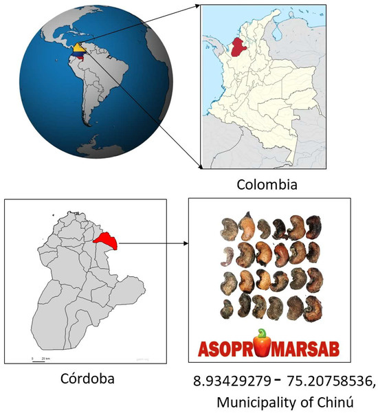 Cashew nutshells were kindly provided by Asopromarsab, a producer organization located in Chinú, Córdoba, Colombia, as shown in Figure 1. Cashew nutshells were received after manual removal of the nut. No chemical, physical, or any other treatment was carried out on them. From this point on, this original condition is referenced as the as-received condition.