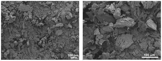 Figure 2 shows angular particles with a rough and porous surface and heterogeneous particle sizes ranging from ~7 to ~150 µm. Irregular and porous particles and even surfaces may enhance the filler matrix bonding in composites due to higher mechanical interlocking [7]. The influence of fillers on the properties of polymer matrix composites has been evaluated by some researchers [9]. They reported that the rigid and 3D irregular shapes of coconut shell particles provided mechanical support and were suitable for distributing stresses. The composites evidenced a higher ultimate strength of 22.9 ± 2.49 MPa; however, as the particles are nonporous, the mechanical interlocking was lower, resulting in lower failure strain values. In contrast, polymer matrix composites with palm shell particles showed extensive interlocking due to their porosity, promoting better failure strain and higher ductility. They also reported an increase in composite hardness due to the augmentation in particle percentage. Other researchers recommend enhancements on natural particle properties such as porosity and surface functionalization by physical or chemical methods. These characteristics might improve filler–matrix interaction and result in superior composite properties [1].