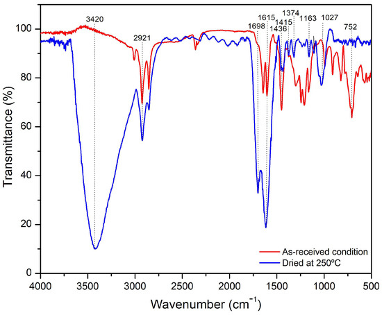 Figure 3 shows the ATR-FTIR spectra for the cashew nutshells in the as-received condition and dried at 250 °C.