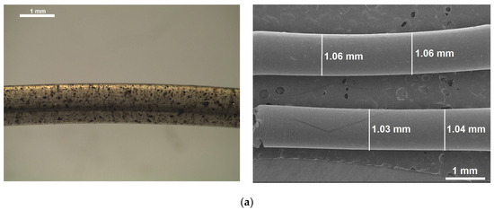 Figure 5 shows the PLA–cashew nutshell particle filaments fabricated in this work. Broadly speaking, the filaments exhibited an even and regular surface and were free of perceptible protuberance, voids, or cross-sectional area changes. Very few particles were observed at the surface: most of them were homogeneously dispersed throughout the filament volume. The filament diameter was 1.05 ± 0.02 mm, 1.08 ± 0.01 mm, and 1.28 ± 0.01 mm for 0.5, 1.0, and 2.0 wt% of particles, respectively.