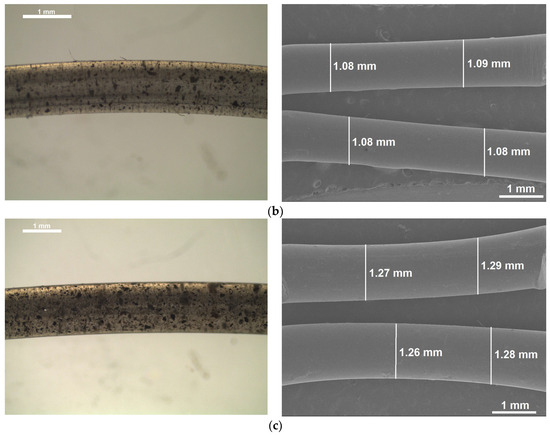 PLA–cashew nutshell particle filaments, (a) 0.5 wt% of particles, (b) 1.0 wt% of particles and (c) 2.0 wt% of particles. Left side: stereo-optical microscopy images. Right side: scanning electron microscopy images.