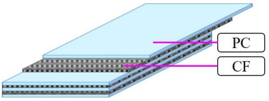 It follows that polycarbonate (PC) constructed from hydrogen and carbon, as shown in Figure 1, is a commonly used thermoplastic (TP) that is a highly transparent engineering plastic with more than 150 times the mechanical strength of tempered glass. PCs are commonly used for protective items, including goggles and face shields, helmets, protective glazing for buildings, windows, household appliances, and covers for electronic equipment, because they are lightweight, have superior properties such as processability and impact resistance [2,3], and can withstand severe weather conditions. PC has a maximum continuous service temperature of 423 K (140 °C) [4]. PC is commonly used for aircraft windows, and also has a short solidification duration that is less than 1/10th of that of epoxy, thus reducing the required energy requirements for fabrication. PC has a higher tensile strength than that of several other polymers, at 55 to 65 Mpa [4], and an excellent Izod impact strength at 19 J [5]. The drawbacks of PC are that it scratches easily, that UV-grade PC is required for outdoor use, and that PC should not be used in contact with alcohols or strong alkalis.