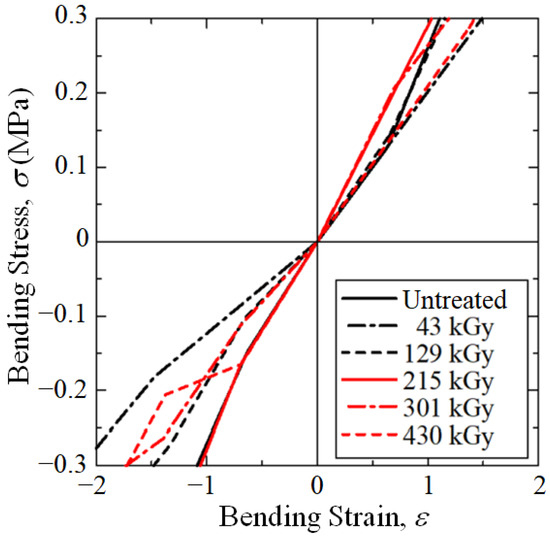 Figure 4 shows that, at median Pe = 0.50, the 215 kGy dose resulted in the highest μi at 2.85 GPa. In addition, Figure 5 shows for the bending stress–strain curves that, at median Pe = 0.50, the 215 kGy HLEBI dose (solid red line) exhibited the highest elastic modulus for tension and compression through the zero point.