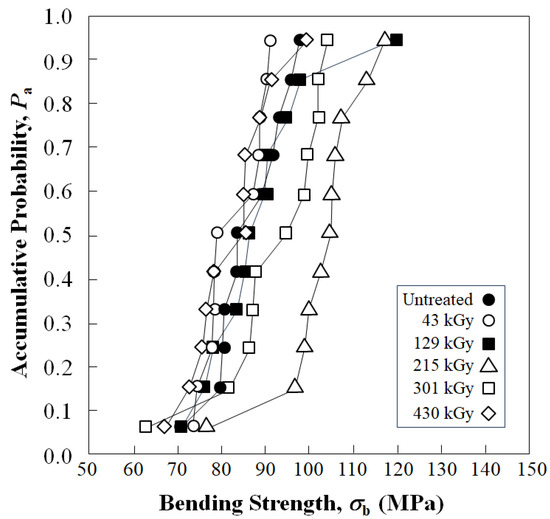 Figure 6 shows experimental results of accumulative probability, Pa, vs. bending strength, σb, of untreated and HLEBI-treated [PC]4[CF]3 samples for 43, 129, 215, 301 and 430 kGy doses.