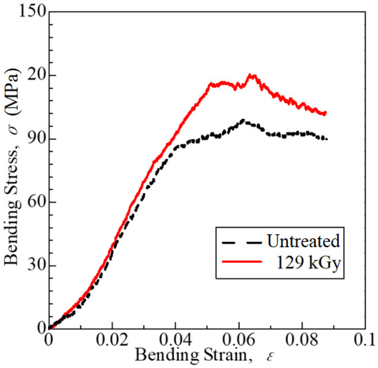 Representative bending stress–strain curves: untreated (black dotted line) and 129 kGy samples (red line) at Pa = 0.94 are shown.