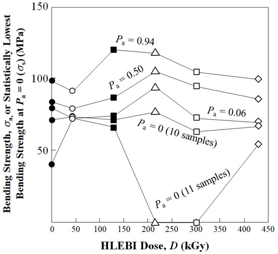 Calculation with the three-parameter Weibull equation was carried out to determine the statistically lowest bending strength σs at Pa = 0 as a function of HLEBI dose. Three-parameter Weibull estimation is typically applied for quality control (QC). When it is assumed that the statistical equation is applicable to the experimental σb value, the Pa is dependent on the risk of rupture [45,46,47]. For predicting the required strength of new structural materials, the σs, coefficient, m and constant (σIII) are the important parameters. The equation is