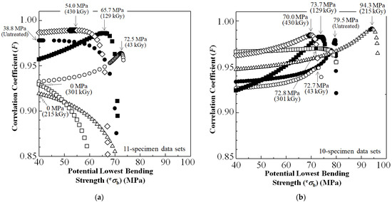 Changes in correlation coefficient (F) versus potential lowest σb value (eσb) for untreated, and HLEBI-treated (to the CF) [PC]4[CF]3 samples for (a) 11-sample data sets, and (b) 10-sample data sets. The lowest bending strength, σs (arrows), is determined at maximum F.