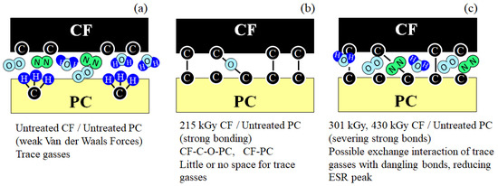 Schematic drawings of bonding states of CF/PC interface of [PC]4[CF]3 samples for (a) untreated, (b) 215 kGy, and (c) higher doses of 301 or 430 kGy HLEBI.