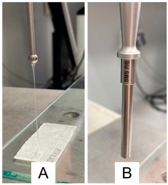 Probes used in the tack test: (A)—spherical probe (P5S) in contact with the A1 patch, (B)—cylindrical probe (C6).
