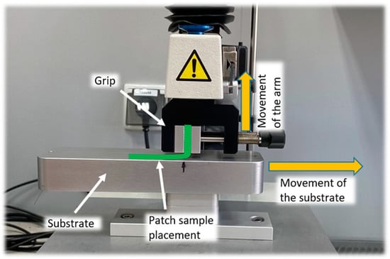 The test was performed according to the USP method for the “Peel adhesion test” described in the monograph “Topical and transdermal drug products—product quality tests” [14]. The scheme of the test setup is presented in Figure 3, and the test parameters are presented in Table 1. Each sample (1 cm × 6 cm) was attached to the flat steel surface (a substrate) with double-sided adhesive tape and pressed with a 1 kg weight for 1 min. One end of the patch (ca. 1.5 cm) was attached to the arm of the texture analyzer and peeled from the substrate under a 90° angle. Based on the acquired force–distance curve, the initial peel force and mean peel force were determined and evaluated.