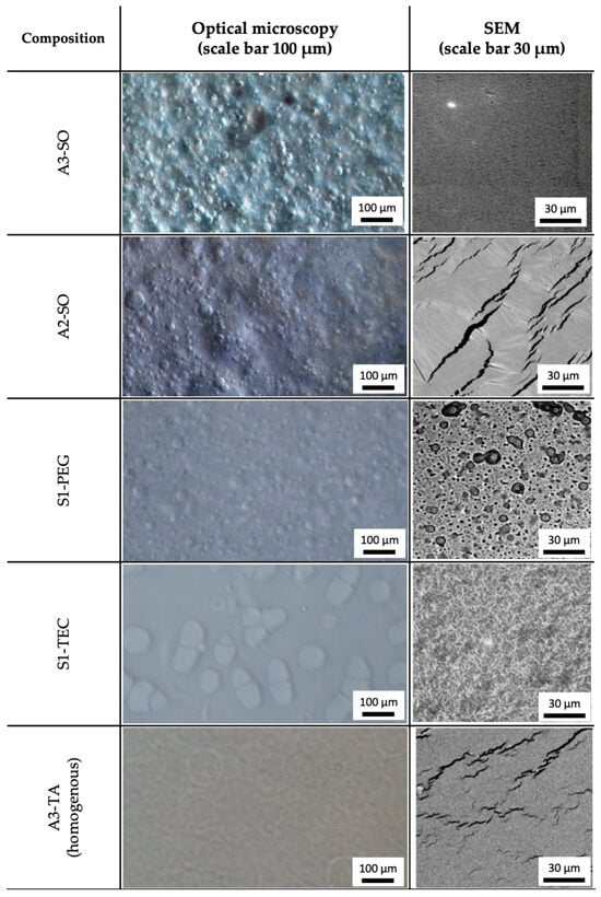 Sample images of incompatibilities in acrylate and silicone patches: droplets of the liquid additives are dispersed in the polymeric matrix, which is visualized by optical microscopy but not seen when the surface of the patch is observed with SEM. A sample of a visually homogenous structure (A3-TA) is also presented.
