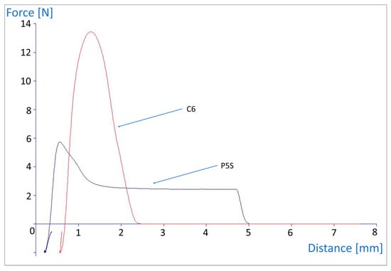 The measurements with the C6 probe resulted in higher values of both detachment force and work of adhesion. This was to be expected due to the higher probe–patch contact surface (ca. 29.6 mm2) than in case of a spherical P5S. The exemplary tackiness graphs obtained for the same composition (A2-TA) with both probe geometries are shown in Figure 6. The differences between measurements performed with C6 or P5S probes are clearly visible also in plain polymer patches, without liquid additives, as shown in Table 3.