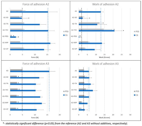 Results of probe tack test (force and work of adhesion) in acrylate PSA formulations: A2 and A3 with liquid additives (average ± SD; n = 10). P5S—spherical probe, C6—cylindrical probe. The reference values (respective patches without liquid additives) are marked as dashed lines.
