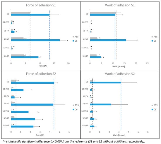 Results of probe tack test in silicone PSA formulations: S1 and S2 with liquid additives (average ± SD; n = 10). P5S—spherical probe, C6—cylindrical probe. The reference values (respective patches without liquid additives) are marked as dashed lines.