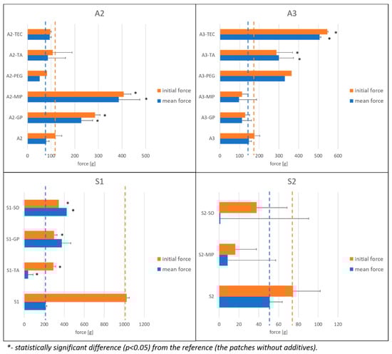 In the S1 patch, the liquid additive TA appears to significantly decrease both the initial and mean peel force, while SO and GP cause an increase in the mean peel force. On the other hand, in S2, both tested liquid additives (SO and MIP) cause a substantial drop in peel forces; however, the significance of the measured values is questionable due to very high standard deviations.