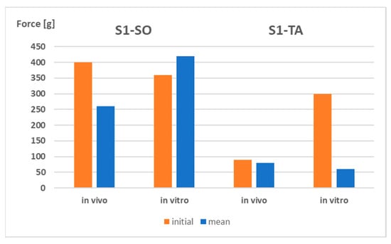 The 90° peel test for silicone patches S1-SO and S1-TA—comparison of the results obtained in vitro and in vivo.