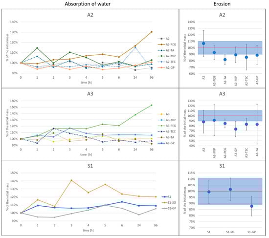 Due to the small size of the samples (ca. 30–70 mg of PSA), the measurements of the small increase in the weight were not sufficiently reproducible—even in the equilibrium phase, the recorded masses varied in some samples by less than 10% from the dry mass (Figure 12). Considering this, the conclusion can be drawn that no significant absorption of water was observed either for the more hydrophilic A2 or A3 patches or for the more hydrophobic S1 patch. Larger changes occurred in A2 and A3 patches with PEG and in S1 with SO, but the effect does not correlate with the physicochemical character of these additives.