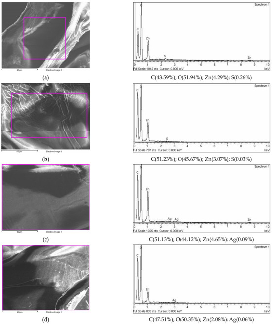 The EDS spectra analysis of the area nearest to the surface (the electron probe can penetrate to a depth of about 1 μm) exhibited the major percentage of elements corresponding to C and O (Figure 3) The detection of Zn on the surface of the microparticles indicated a part of the Zn is localized near the surface. The small amount of detected S was probably a residue of sulfate used during formulation preparation (cation donor solution—ZnSO4). In silver-loaded microparticles, it is also localized near the surface.