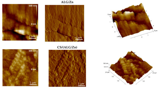 The AFM images presented in Figure 4 and Figure 5 complemented the SEM analysis of the surface morphology. The scanned sample area presented by topographic images of height data is shown as the “top view” characterizing individual microparticle morphology and the “3D surface view” with corresponding color scale characterizing the microparticle 3D-height distribution (Figure 4), while the characteristic vertical profile (“section analysis”) of a single microparticle reveals a quantitative 2D height analysis (Figure 5). The ALG/Zn microspheres have granules on the surface that are spatially oriented due to the grain structure and have a regular spherical shape linearly arranged due to the cross-linking of the negatively charged alginate chains by Zn2+ ions. A similar structure was already described by Simpliciano et al. [45]. Such crosslinking leads to a high value of roughness (Ra = 76 ± 1 nm) (Table 2). The addition of chitosan does not change grain morphology but leads to a loss of directionality and restricts crosslinking to two dimensions, which is expressed in a lower roughness (Ra = 7.47 ± 0.02 nm). The addition of Ag+ to ALG/Zn leads to a reduction in the size of the grains, which still have a regular spherical shape, while the degree of lateral crosslinking is reduced and manifests itself in a reduced roughness (Ra = 21.97 ± 0.52 nm) in respect to the surface of ALG/Zn (see section analysis profiles in Figure 5). The addition of chitosan to ALG/(Zn+Ag) microspheres only slightly reduces the crosslinking that is still directional, resulting in a slightly lower roughness (Ra = 18.62 ± 0.45 nm).
