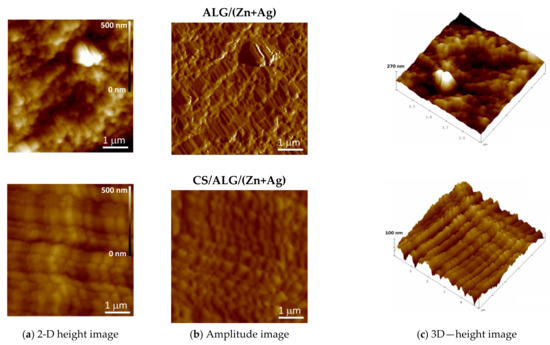 All characteristic band intensities in the spectrum of CS/(ALG/(Zn+Ag)) are slightly reduced compared to those of ALG/(Zn+Ag). The broad band around 3300 cm−1 is mainly attributed to N-H stretching vibrations (amide A), although in that region the N-H and O-H stretching vibrations overlap [40]. Transmission reduction in this region shows that Ag+ is bound to N-H groups. Other changes observed in the wavenumbers (shifts from 1585 to 1571 cm−1, 1406 to 1392 cm−1, and from 1020 to 1045 cm−1) are related to the bending of N-H groups, by stretching of C-N groups and N-H oscillating deformation. All these changes indicate that Ag+ ions bind to nitrogen atoms and thus reduce the intensity of vibrations of N-H bonds [41].