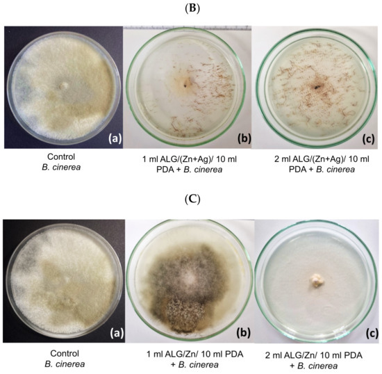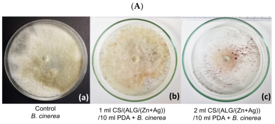 These results suggest that treatments with three types of microparticles can significantly inhibit the growth of B. cinerea. The most effective were ALG/(Zn+Ag) microspheres applied in a volume of 2 mL, which suppressed B. cinerea in a significant percentage of 98.9% and also led to a reduction in sporulation. Another significant treatment was the treatment with ALG/Zn microspheres, which suppressed the pathogen by 92.3%. The CS/(ALG/(Zn+Ag)) microcapsules have a weaker antifungal effect than the other variants, presumably because these microparticles release the ions in the substrate more slowly. Because B. cinerea is a fast-growing pathogen, the ions from these microparticles could not be released quickly enough to suppress B. cinerea by a significant percentage. This is confirmed by the remaining variants without chitosan, where the release of ions in the substrate was significantly faster, which is confirmed by the high levels of inhibition. Since the method was used where the fungus directly absorbs components from the substrate, in the version with chitosan, the action of the inhibitory ions was delayed, which allowed the pathogen to develop. The results are consistent with the results of various studies that confirm the significant suppression of pathogenic microorganisms treated with metal ions [53,54,55]. The degrees of suppression depend on the composition of the microparticles, their combination with other elements, and the tolerance of the target pathogen, as well as the amount of released cations (Figure 6a,b).