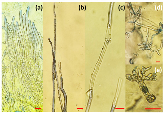 Hyphae deformations were more significant in the variants that contained 2 mL of medium. An unusual pattern of hyphal growth and deformation was particularly observed in treatment with ALG/Zn microspheres (Figure 8d,e), while in the treatment containing a combination of zinc and silver ions, that is, with ALG/(Zn+Ag) microspheres, the hyphae were empty and had a degraded cell wall (Figure 8c). Hyphae treated with CS/(ALG/(Zn+Ag)) microcapsules (Figure 8b) show a “melted” appearance and loss of cell wall stability, although the contents within the hyphae were present. Compared to the control, sporulation was partially reduced.
