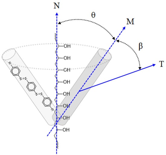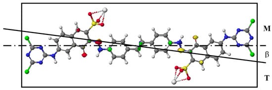 The molecular axis M for a dye is defined as the longest axis passing through the molecule and encompassing the dye’s π chromophore, as illustrated in Figure 4. To calculate the β values in the most stable conformation of the dichroic dyes, we employed CAChe in combination with the CONFLEX/MM3 method, followed by the ZINDO method.