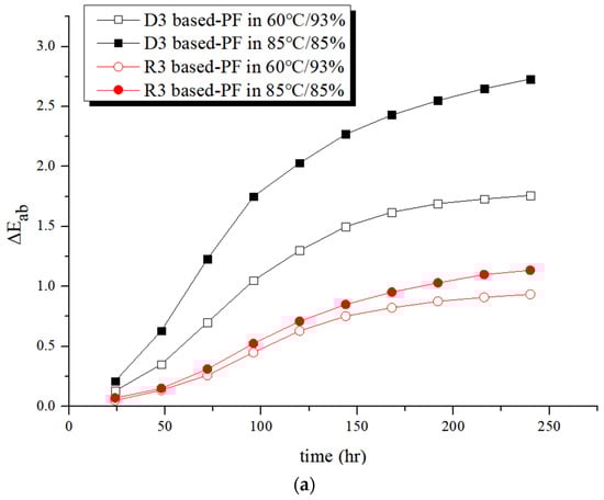 For commercial display applications, colored optical parts such as color filters, polarizing films, and protective films should have a chromaticity difference (ΔEab) value of less than 3 after 240 h of testing under specified conditions [,]. Figure 5 shows the color difference (ΔEab) value of direct dye and reactive dye-based polarizing films under high temperature and humidity.